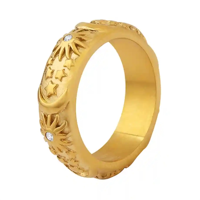 Denne smukke forgyldte ring til kvinder er inspireret af universets magi med fine stjerner og solmotiver, der giver ringen et unikt og feminint udtryk. Ringen er 6 mm bred, hvilket skaber den perfekte balance mellem elegance og karakter og CZ sten