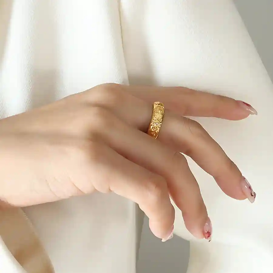 Fremstillet i rustfri stål med guldfinish, er ringen både holdbar, farvebestandig og velegnet til daglig brug. Det detaljerede relief-design giver ringen dybde og eksklusivitet, mens den glatte inderside sikrer en behagelig pasform hele dagen.