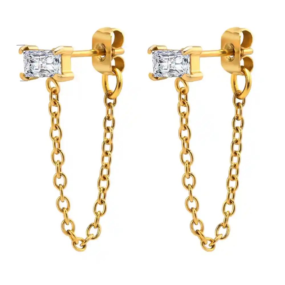 Øreringen er fremstillet i rustfrit stål med en flot IP forgyldt overflade, som giver en varm gylden farve og god holdbarhed. Kombinationen af den klare zircon sten og den elegante kæde giver et feminint og moderne smykke, der passer perfekt til både hverdag og fest.