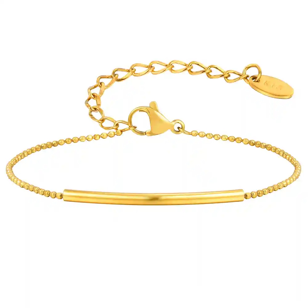 Dette elegante armbånd i forgyldt rustfrit stål udstråler enkelhed og finesse. Den slanke bar-detalje kombineret med den fine kuglekæde giver et moderne og feminint udtryk, der passer perfekt til både hverdag og fest. Armbåndet er justerbart fra 16 til 21 cm, så det sidder smukt på ethvert håndled.