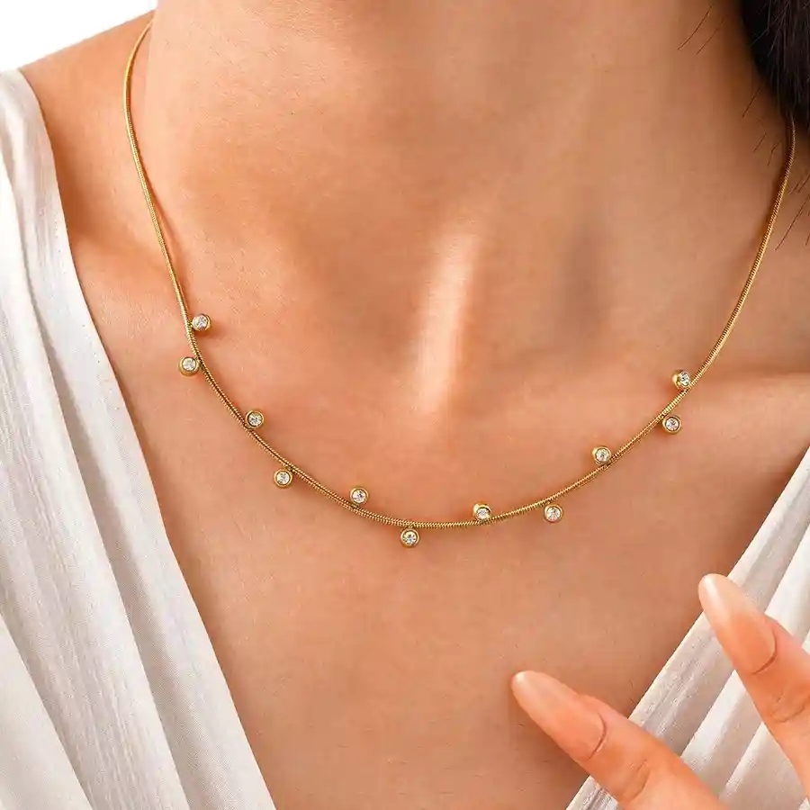 Denne elegante halskæde til kvinder udstråler enkel luksus og feminin finesse. Den er fremstillet i forgyldt ædelstål og prydet med små hvide zirkoner, der smukt fanger lyset ved enhver bevægelse.