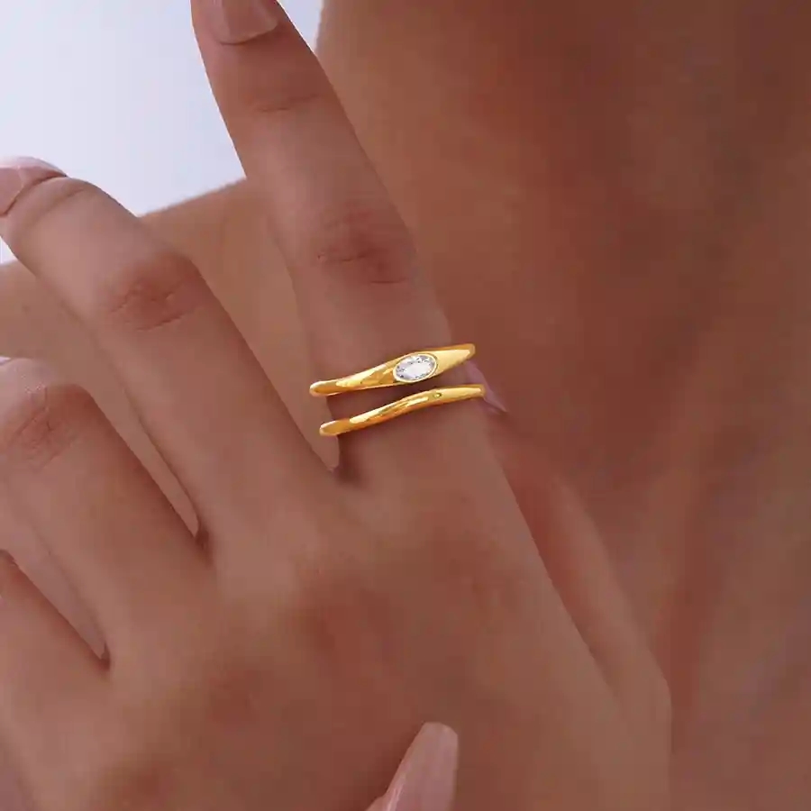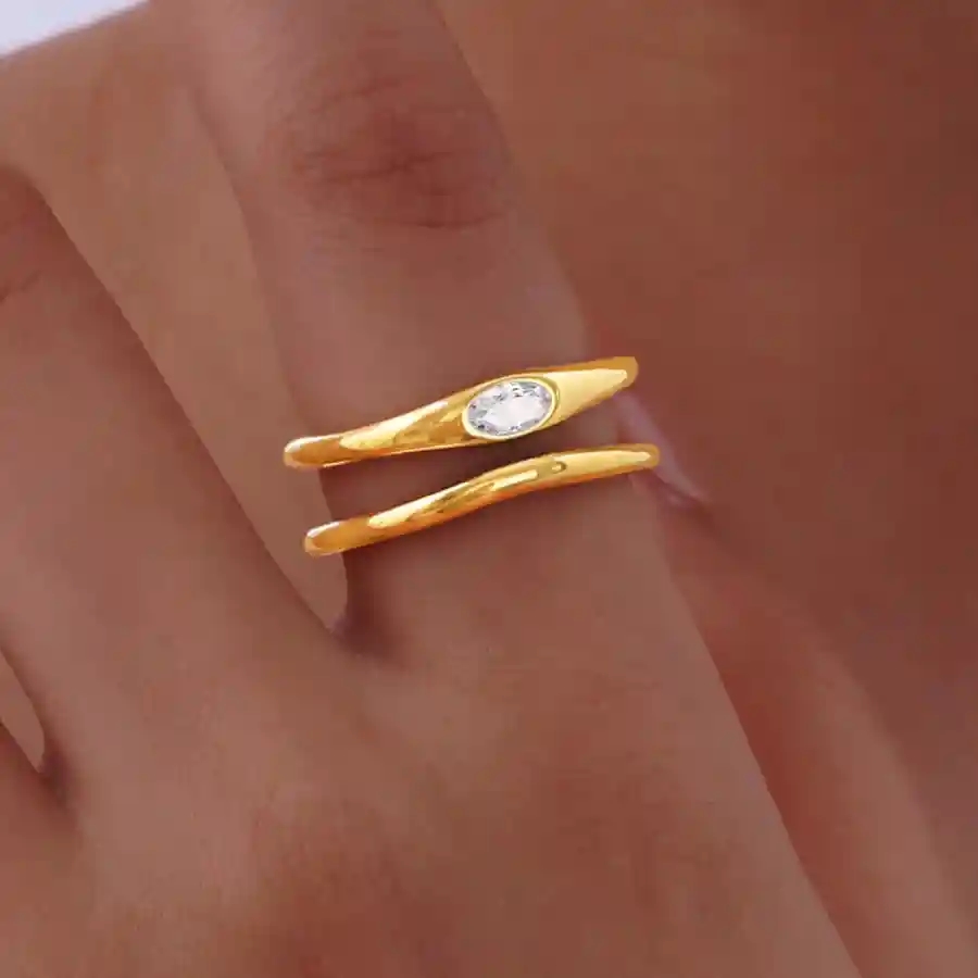 Forkæl dig selv med denne elegante forgyldte ring i ædelstål, designet med et bølgende, moderne twist. Den smukke ovale CZ sten fanger lyset og giver et subtilt, men eksklusivt skær, der fremhæver din feminine stil. Den åbne form gør ringen både komfortabel og justerbar, så den passer perfekt til enhver finger.