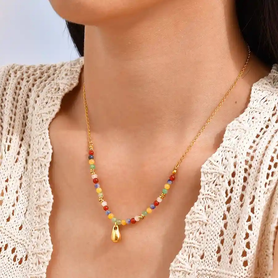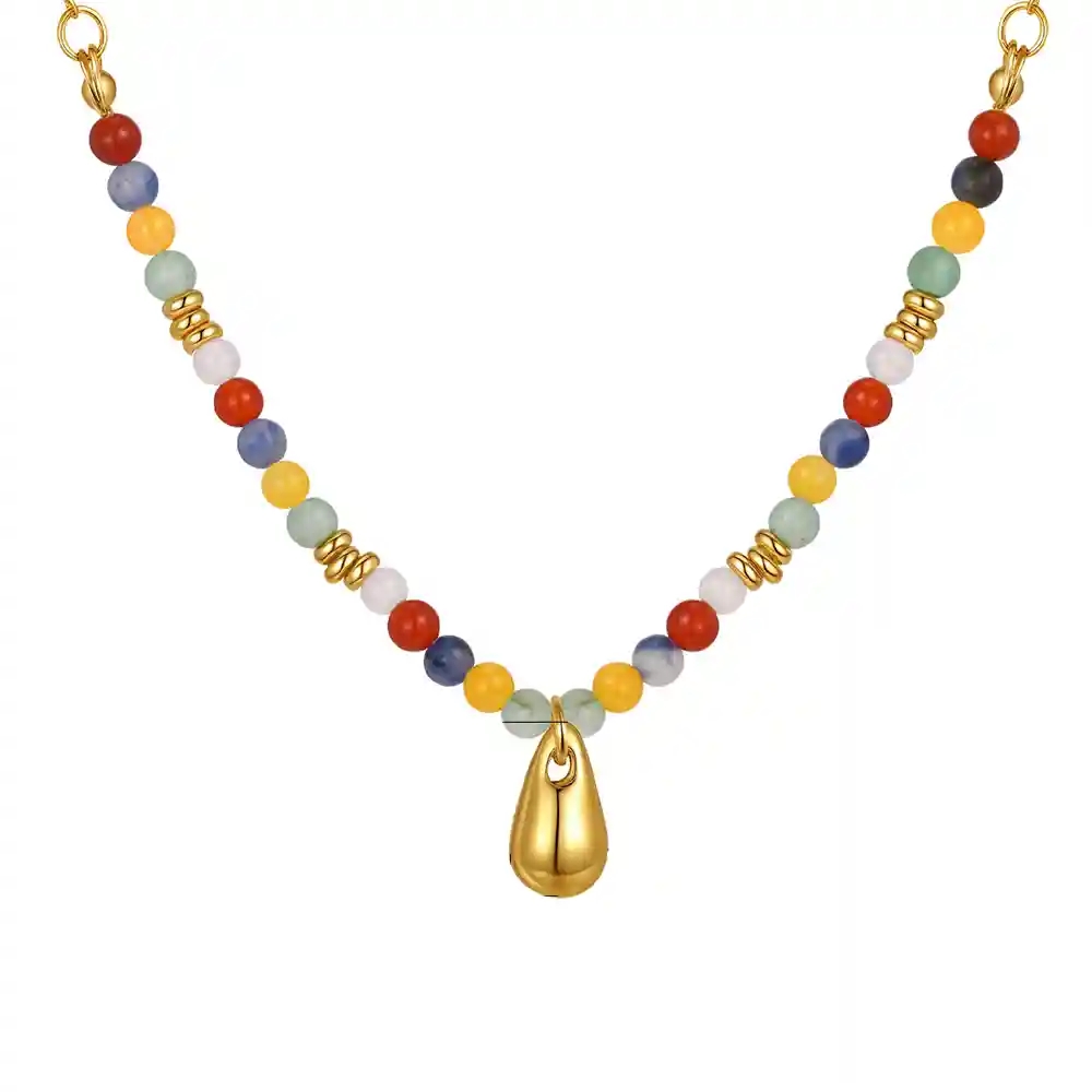 Farverig halskæde med ædelstensperler og forgyldt dråbevedhæng i rustfrit ædelstål.