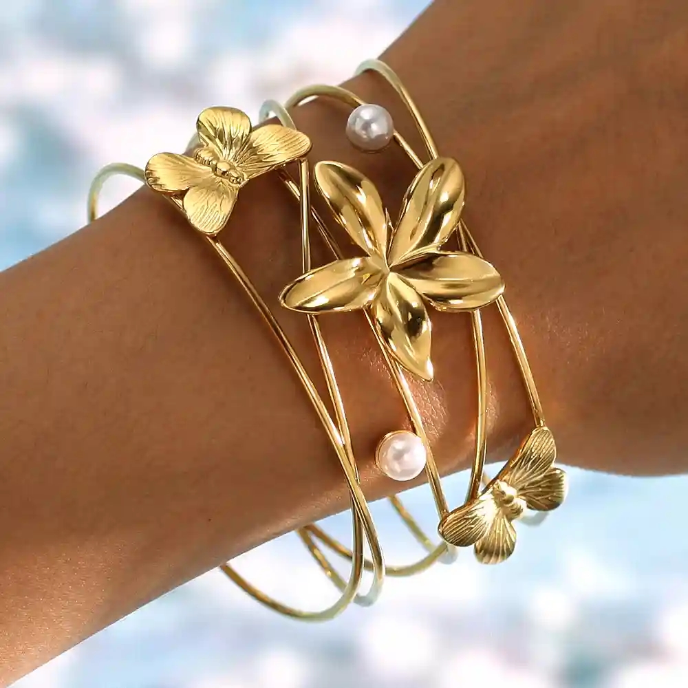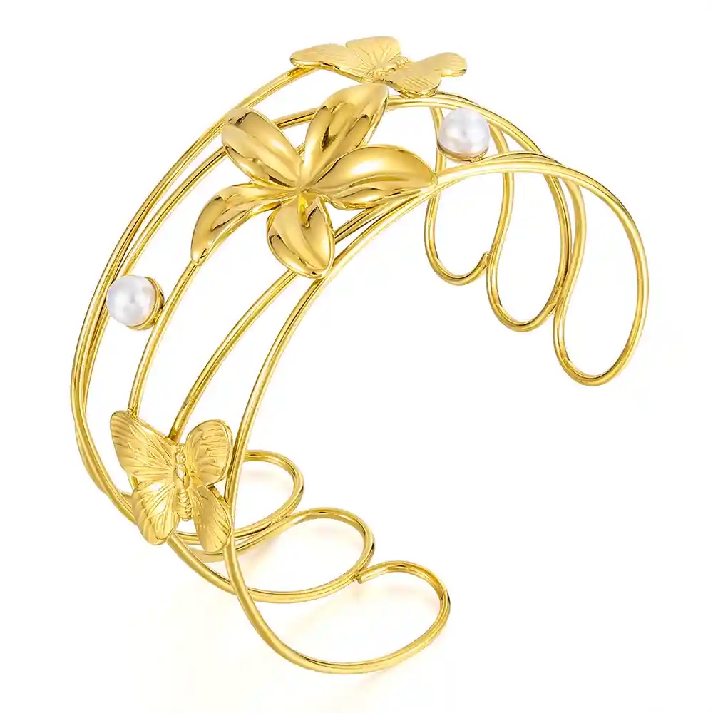 Oplev feminin elegance med Golden Grace, et forgyldt armbånd i ædelstål designet til kvinder, der elsker lethed og luksus. Armbåndet har et kunstnerisk design med delikate blomster og sommerfugle, smukt kombineret med små hvide perler, der tilfører et eksklusivt og tidløst udtryk.
