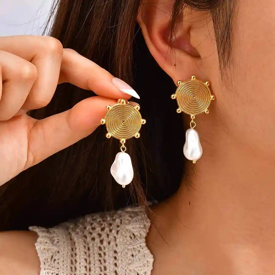 Tilføj et strejf af luksus, femininitet og boho elegance til dit look med vores Golden Spiral Pearl Drop Ørering. Den runde, forgyldte spiral med små dekorative kugler giver et kunstnerisk og eksklusivt udtryk, mens den organiske perleform skaber en smuk, naturlig balance.